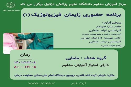 برنامه حضوری زایمان فیزیولوژیک (1) مورخ1401/12/08 برگزار می گردد. ثبت نام در سامانه آموزش مداوم