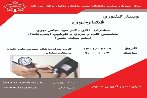 برگزاری وبینار فشارخون مورخ 1401/02/07.ثبت نام در سامانه آموزش مداوم