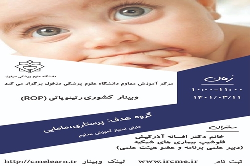 برگزاری وبینار رتینوپاتی (ROP) مورخ 1401/03/11. ثبت نام در سامانه آموزش مداوم
