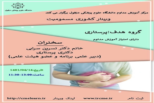 وبینار مسمومیت وبینارمسمومیت مورخ1401/04/14.ثبت نام در سامانه آموزش مداوم گروه خبری : اطلاعیه ها کد خبر : 12694 کلمات کلیدی