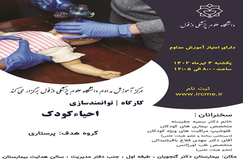کارگاه احیا کودک کارگاه احیا کودک مورخ1402/04/04برگزار می گردد. ثبت نام در سامانه آموزش مداوم گروه خبری : اطلاعیه ها کد خبر : 15080 کلمات کلیدی