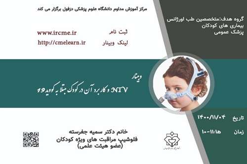برگزاری وبینار NIV و کاربرد آن در کودک مبتلا به کووید19مورخ 1400/11/04 . ثبت نام در سامانه آموزش مداوم