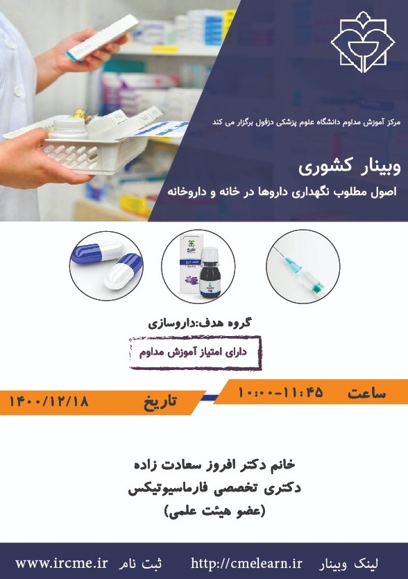 وبینار اصول مطلوب نگهداری داروها در خانه و داروخانه مورخ 1400/12/18