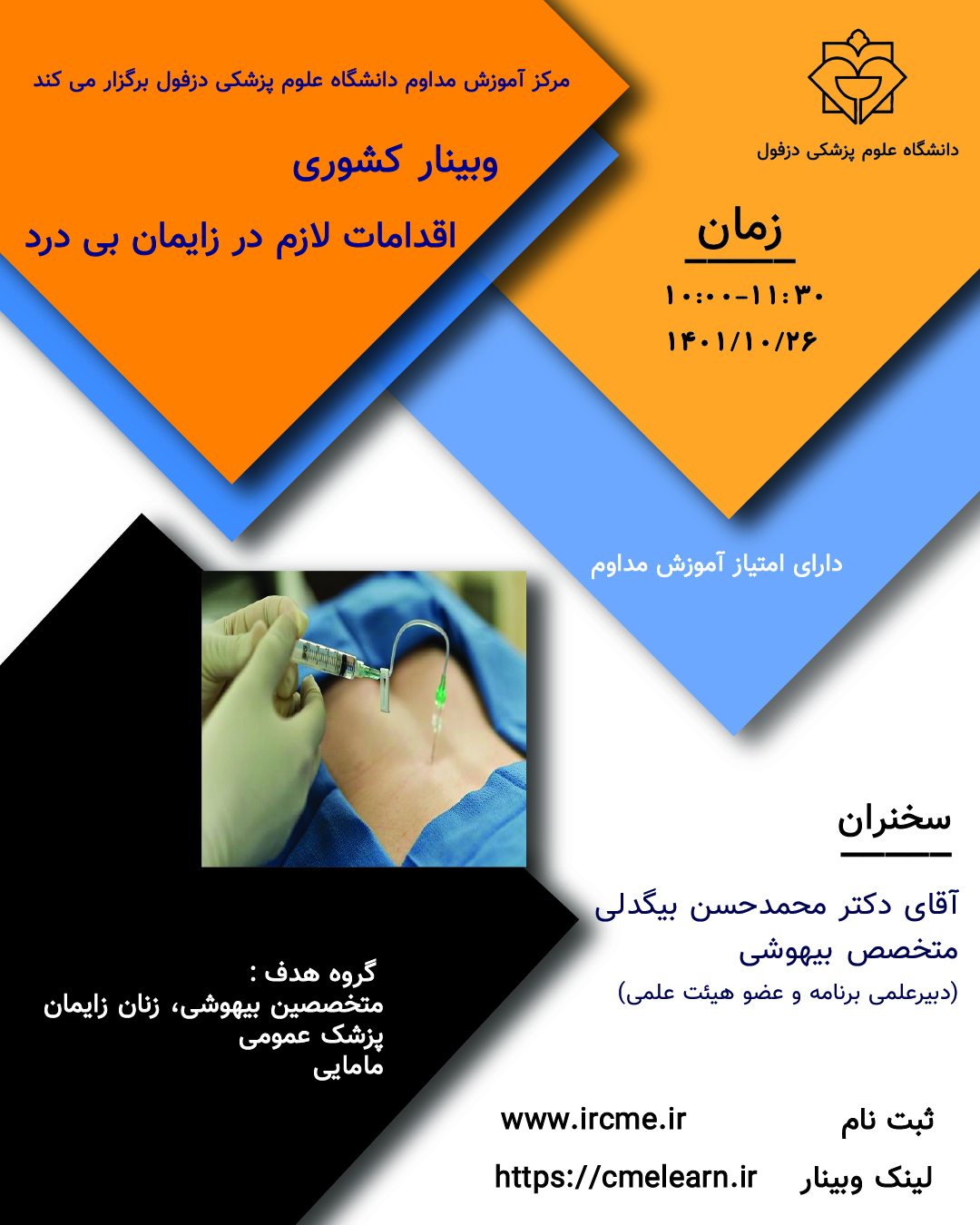 مدیر مرکز آموزش مداوم دانشگاه علوم پزشکی دزفول جناب آقای دکتر حسین شمشیرگرزاده با همکاری کارشناسان محترم این مرکز وبینار اقدامات لازم در زایمان بی درد را با حضور دبیرعلمی برنامه آقای دکتر محمدحسن بیگدلی متخصص بیهوشی(عضو هیئت علمی)برای گروه هدف بیهوشی، زنان زایمان،پزشک عمومی و مامایی مورخ 1401/10/26در سالن کامپیوتر معاونت آموزشی باموضوع انواع زایمان های بی دردی در زایمان، آشنایی با گاز انتونوکس،آشنایی با داروهای وریدی جهت بی دردی، آشنایی با تکنیک های بی دردی رژیونالبرگزار گردید که مورد استقبال گسترده گروه های هدف قرار گرفت.