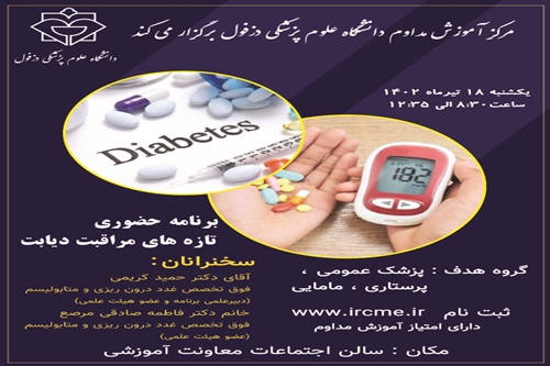 برنامه حضوری تازه های مراقبت دیابت برنامه حضوری تازه های مراقبت دیابت مورخ1402/04/18برگزار می گردد. ثبت نام در سامانه آموزش مداوم گروه خبری : اطلاعیه ها کد خبر : 15150 کلمات کلیدی