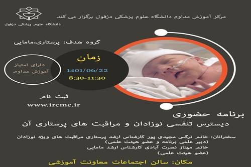 برنامه حضوری دیسترس تنفسی نوزادان و مراقبت های پرستاری آن مورخ 1401/06/22برگزار می گردد.ثبت نام در سامانه آموزش مداوم