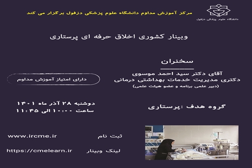 وبینار اخلاق حرفه ای پرستاری مورخ1401/09/28 برگزار می گردد. ثبت نام در سامانه آموزش مداوم