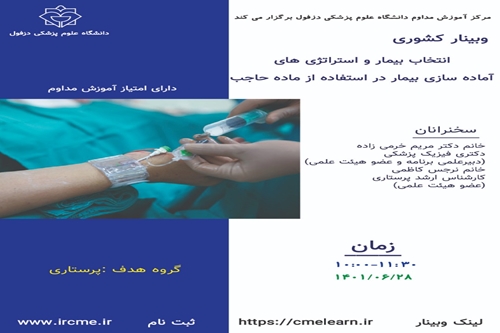 وبینار انتخاب بیمار و استراتژی های آماده سازی بیمار در استفاده از ماده حاجب مورخ 1401/06/28برگزار می گردد.ثبت نام در سامانه آموزش مداوم