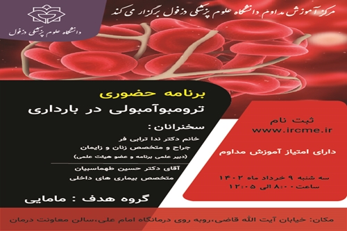 برنامه حضوری ترومبوآمبولی در بارداری مورخ1402/03/09برگزار می گردد. ثبت نام در سامانه آموزش مداوم