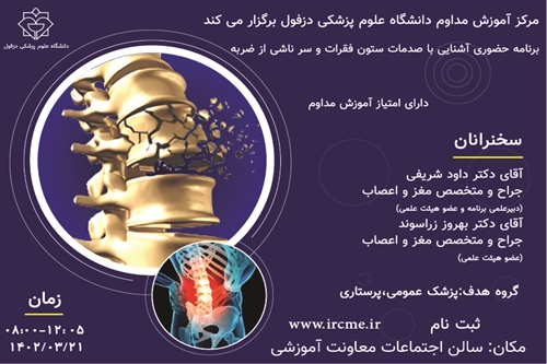 برنامه حضوری آشنایی با صدمات ستون فقرات مورخ1402/03/21برگزار می گردد. ثبت نام در سامانه آموزش مداوم