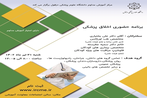 برنامه حضوری اخلاق پزشکی برنامه حضوری اخلاق پزشکی مورخ 1402/04/31 برگزار می گردد.ثبت نام در سامانه آموزش مداوم دانشگاه علوم پزشکی دزفول گروه خبری : اطلاعیه ها کد خبر : 15190 کلمات کلیدی