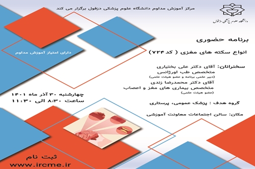 برنامه حضوری انواع سکته های مغزی( کد 724) مورخ1401/09/30 برگزار می گردد. ثبت نام در سامانه آموزش مداوم