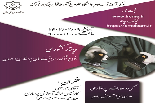 برنامه حضوری انواع شوک،مراقبت های پرستاری و درمان  مورخ1402/02/09برگزار می گردد. ثبت نام در سامانه آموزش مداوم