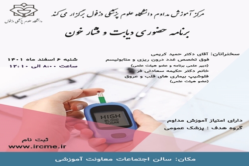 برنامه حضوری دیابت و فشارخون مورخ1401/12/06 برگزار می گردد. ثبت نام در سامانه آموزش مداوم