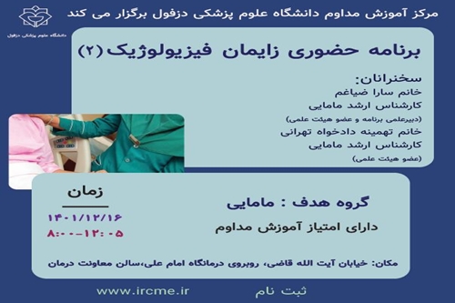 برنامه حضوری زایمان فیزیولوژیک (2) مورخ1401/12/16 برگزار می گردد. ثبت نام در سامانه آموزش مداوم