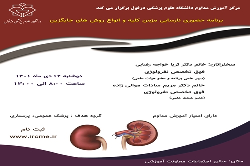 برنامه حضوری نارسایی مزمن کلیه و انواع روش های جایگزین مورخ1401/10/12 برگزار می گردد. ثبت نام در سامانه آموزش مداوم