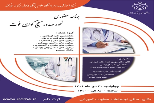 برنامه حضوری نحوه صدور صحیح گواهی فوت برنامه حضوری نحوه صدور صحیح گواهی فوت مورخ1401/10/21 برگزار می گردد. ثبت نام در سامانه آموزش مداوم گروه خبری : اطلاعیه ها کد خبر : 13432 کلمات کلیدی