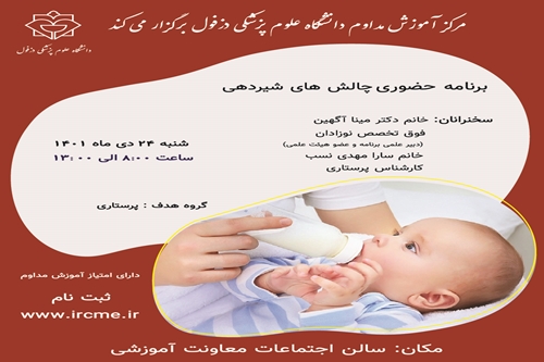 برنامه حضوری چالش های شیردهی برنامه حضوری چالش های شیردهی مورخ1401/10/24 برگزار می گردد. ثبت نام در سامانه آموزش مداوم گروه خبری : اطلاعیه ها کد خبر : 13457 کلمات کلیدی