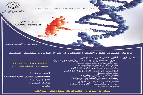 برنامه حضوری ژنتیک اجتماعی مورخ1402/03/20برگزار می گردد. ثبت نام در سامانه آموزش مداوم