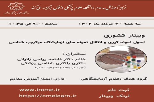 برنامه نمونه گیری و انتقال نمونه های آزمایشگاهی مورخ1402/03/30برگزار می گردد. ثبت نام در سامانه آموزش مداوم