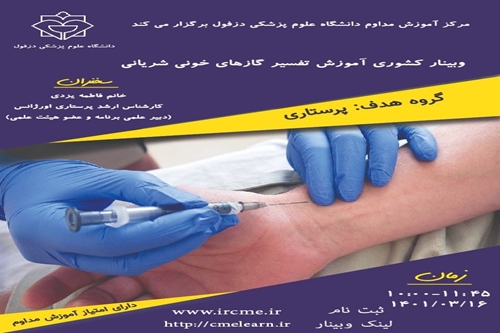 برگزاری وبینار آموزش تفسیر گازهای خونی شریانی مورخ 1401/03/16. ثبت نام در سامانه آموزش مداوم دانشگاه علوم پزشکی دزفول