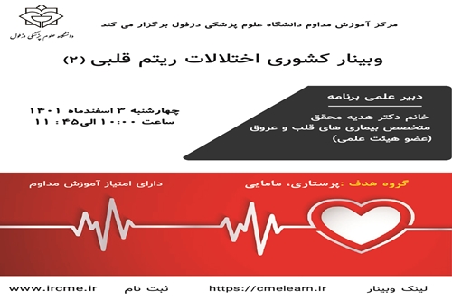 وبینار اختلالات ریتم قلبی2 مورخ1401/12/03 برگزار می گردد. ثبت نام در سامانه آموزش مداوم