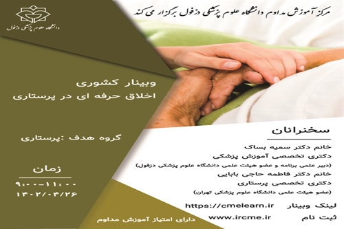 برگزاری وبینار اخلاق حرفه ای در پرستاری مورخ 1402/04/26 ثبت نام در سامانه آموزش مداوم دانشگاه علوم پزشکی دزفول