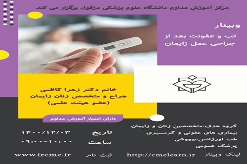 وبینار تب و عفونت بعد از جراحی عمل زایمان وبینار تب و عفونت بعد از جراحی عمل زایمان مورخ 1400/12/02 برگزار می گردد. ثبت نام در سامانه آموزش مداوم گروه خبری : اطلاعیه ها کد خبر : 12091 کلمات کلیدی