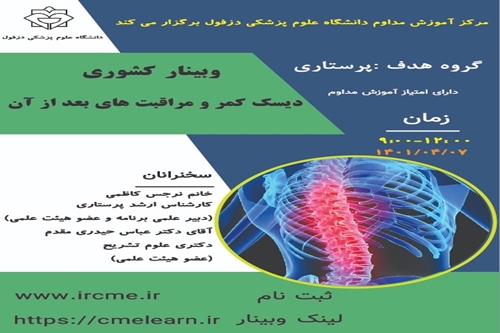 وبینار دیسک کمر و مراقبت های بعد از آن وبینار دیسک کمر و مراقبت های بعد از آن مورخ1401/04/07.ثبت نام در سامانه آموزش مداوم گروه خبری : اطلاعیه ها کد خبر : 12658 کلمات کلیدی