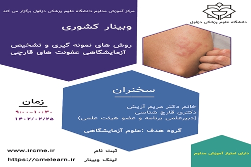 وبینار روش های نمونه گیری و تشخیص آزمایشگاهی عفونت های قارچی مورخ1402/02/25برگزار می گردد. ثبت نام در سامانه آموزش مداوم