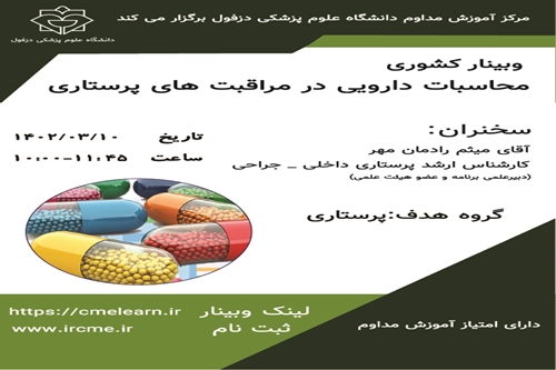 وبینار محاسبات دارویی در مراقبت های پرستاری مورخ1402/03/10برگزار می گردد. ثبت نام در سامانه آموزش مداوم