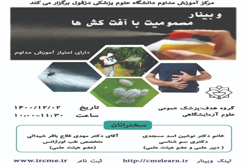 وبینار مسمومیت با آفت کش ها وبینار مسمومیت با آفت کش ها مورخ 1400/12/03 برگزار می گردد. ثبت نام در سامانه آموزش مداوم گروه خبری : اطلاعیه ها کد خبر : 12092 کلمات کلیدی