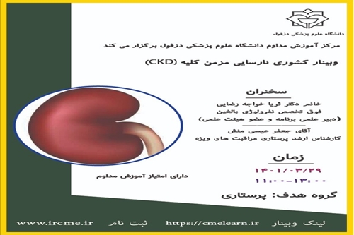 برگزاری وبینار نارسایی مزمن کلی(CKD)مورخ 1401/03/29. ثبت نام در سامانه آموزش مداوم دانشگاه علوم پزشکی دزفول