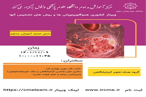 وبینار هموگلوبینوپاتی ها و روش های تشخیص آنها مورخ 1401/11/09 برگزار می گردد. ثبت نام در سامانه آموزش مداوم