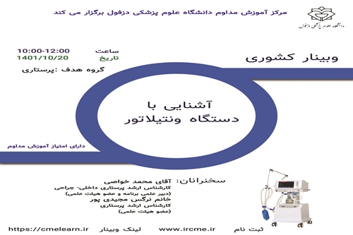 وبینار کشوری آشنایی با دستگاه ونتیلاتور وبینار آشنایی با دستگاه ونتیلاتور مورخ1401/10/20 برگزار می گردد. ثبت نام در سامانه آموزش مداوم گروه خبری : اطلاعیه ها کد خبر : 13431 کلمات کلیدی