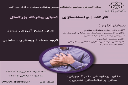 کارگاه احیای پیشرفته بزرگسال کارگاه احیای پیشرفته بزرگسال مورخ1402/04/20برگزار می گردد. ثبت نام در سامانه آموزش مداوم گروه خبری : اطلاعیه ها کد خبر : 15155 کلمات کلیدی